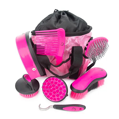 Stunningly beautiful glitter grooming kit. Includes 7 matching brushes. Handy size bag with drawstring closure and multiple handy pockets. Super fun colours.
