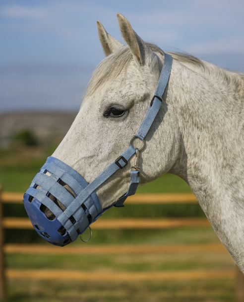 The grazzing muzzle is an excellent way to restrict your horses grass intake when he is at risk of laminitis. Wearing a muzzle still allows your horse to be out on pasture as normal, can still drink as normal and exercise as normal. Just do his normal paddock thing with a little less grass intake.
