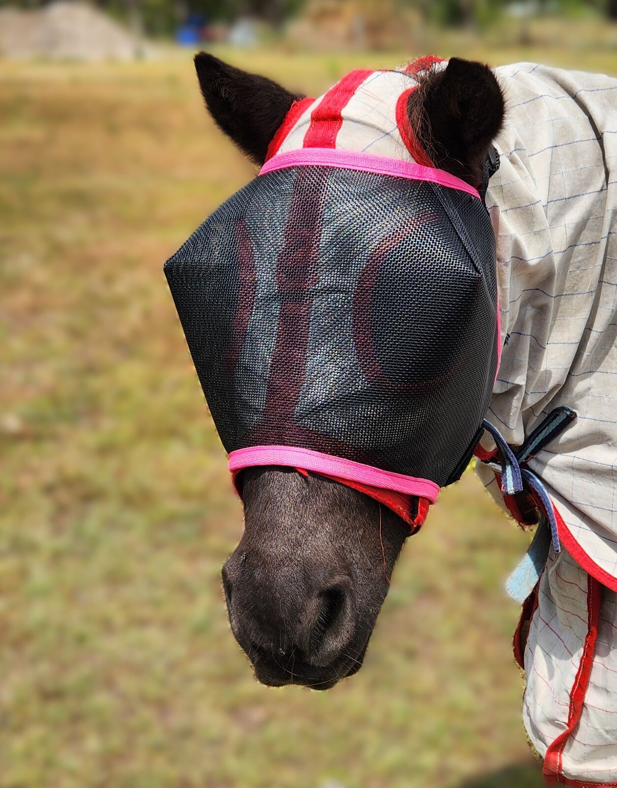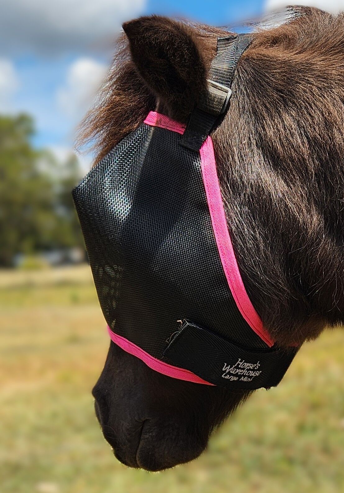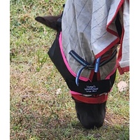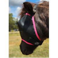 Horses Warehouse are the best fitting mini fly mask on the market. Our design hugs your mini's face to keep the flys out. Eyes darts are positioned correctly over the eyes to keep the mesh off the eyes. We use quality mesh that is stiff enough to hold its shape but soft enough to be comfortable to wear 24/7. Not only does this mask protect your mini's eyes from flys and bitting insects but also sun protection. Our masks have adjustable head straps and velcro chin straps.