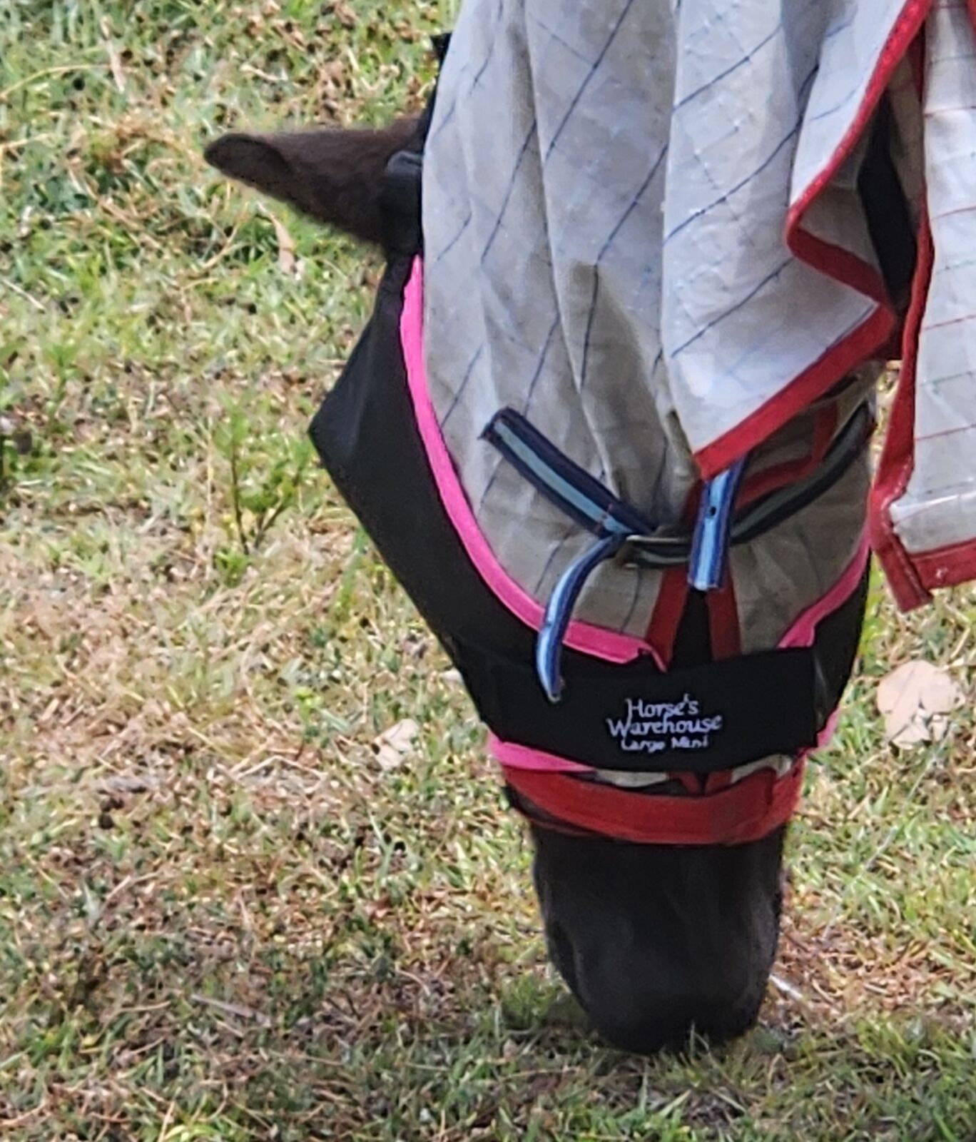 Our model is a mini pony which is in a 4'0 rug size , wears the Large Mini size mask.