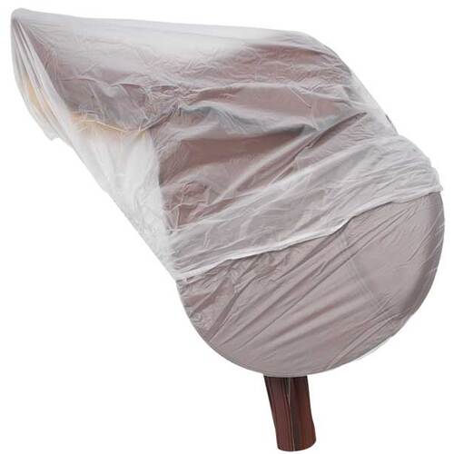Clear plastic cover with elastic binding offers secure protection as a saddle cover or a rain cover when riding.